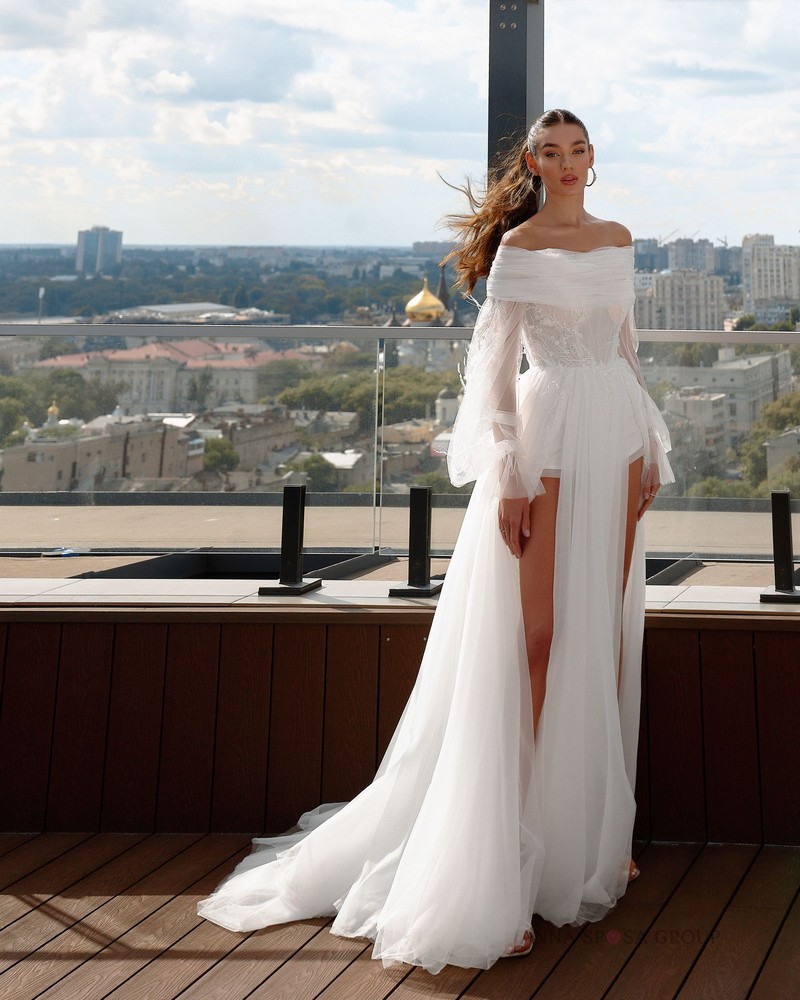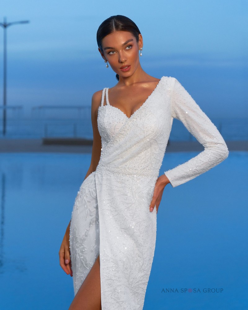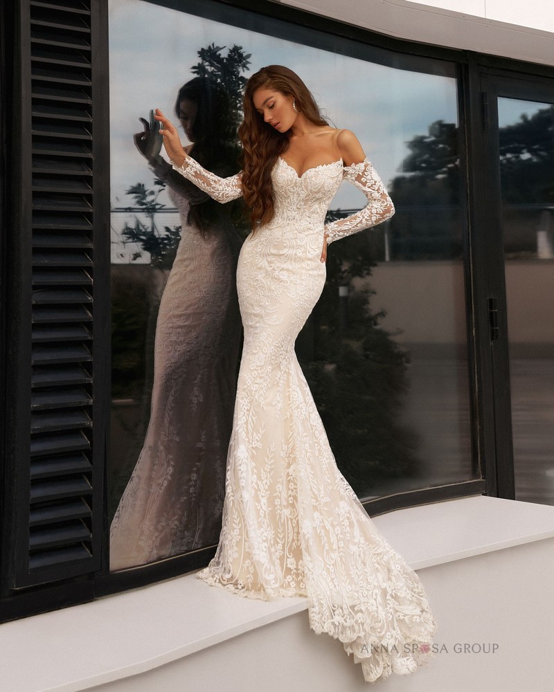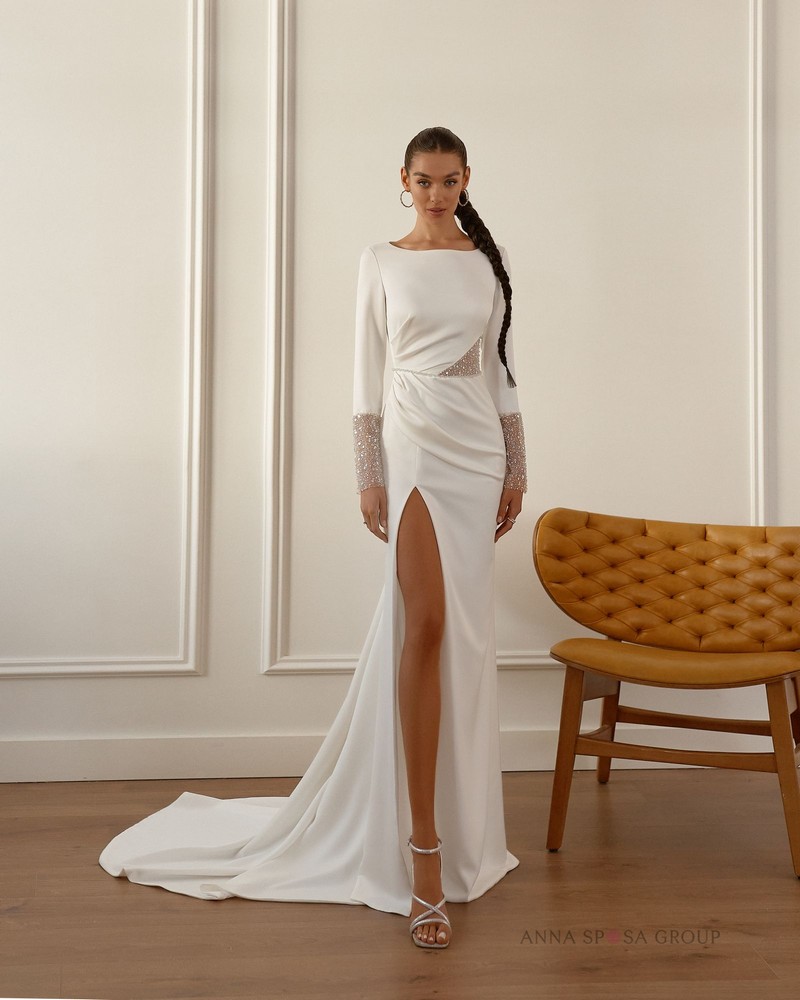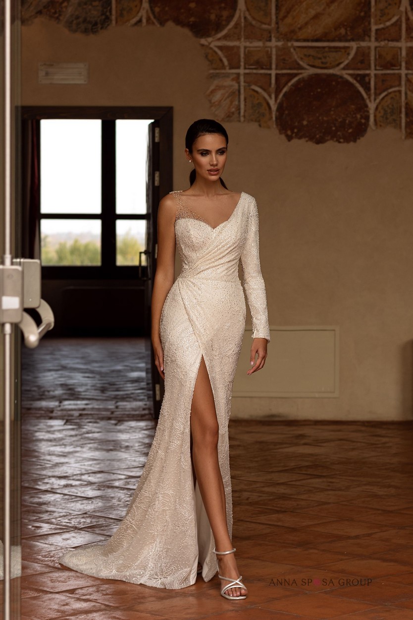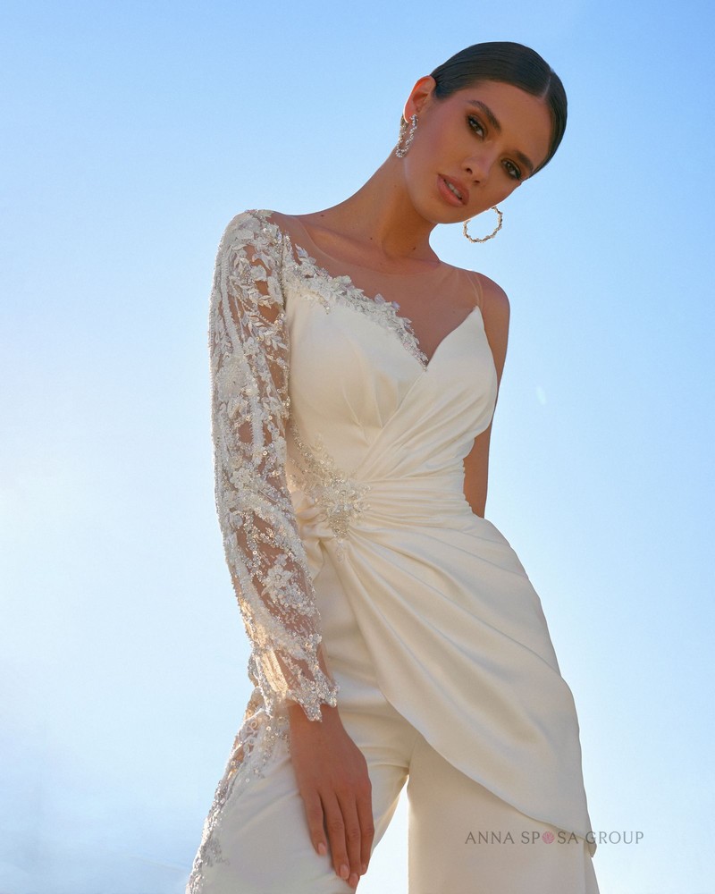 Luxusní šaty mořské panny v minimalistickém stylu s odnímatelnou pláštěnkou z tylu. Efektní vypasovaný střih dokonale modeluje siluetu a řasení na živůtku zdůrazňuje linii pasu. A vysoký rozparek u nohou dělá vzhled ještě působivějším.