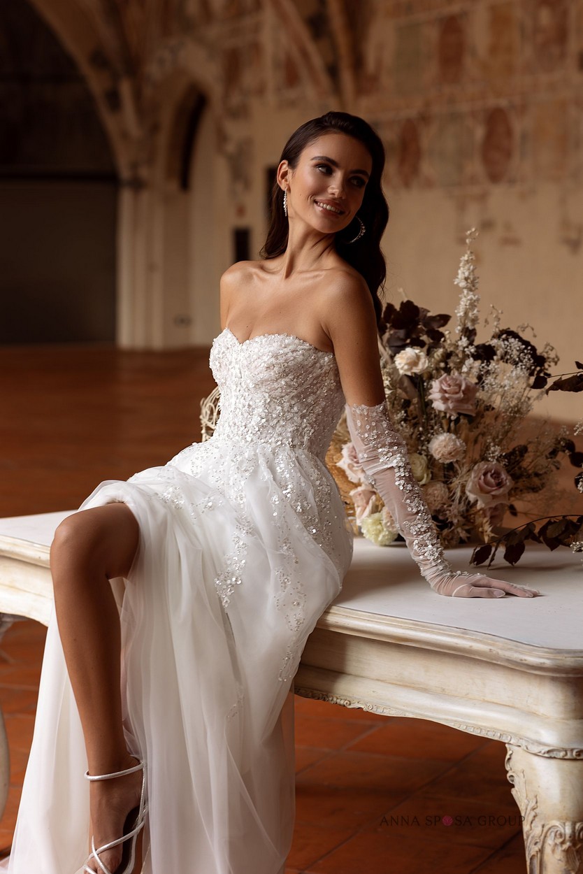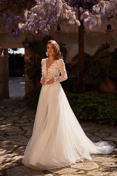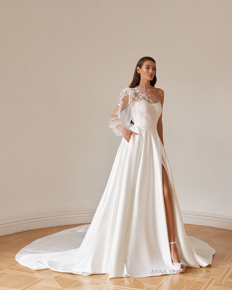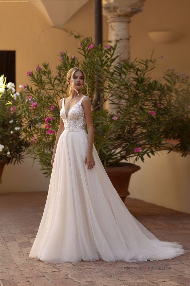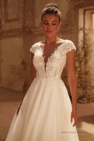 Jednoduše úžasné šaty s jemnou a romantickou siluetou. Živůtek se srdíčkovým výstřihem a nařasením je doplněn o rukávy, které je možné sundat.