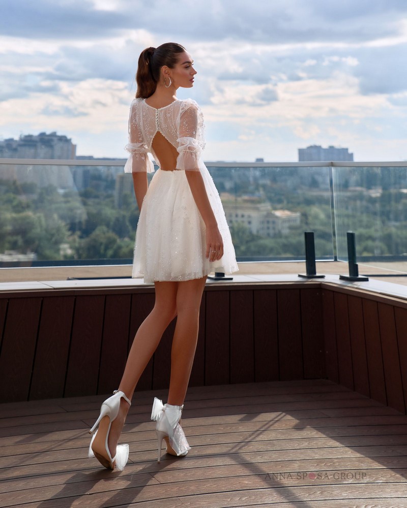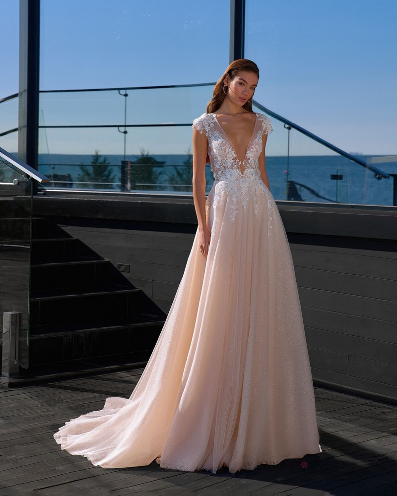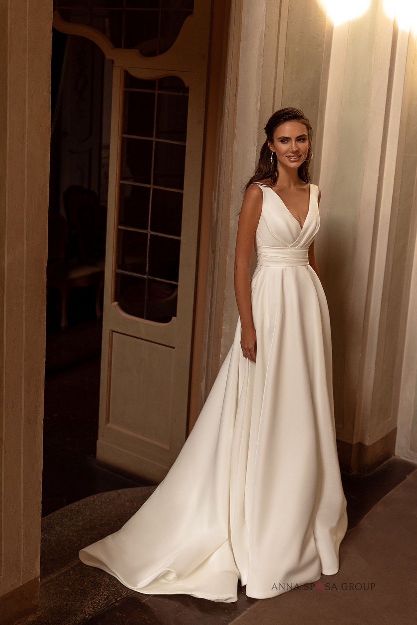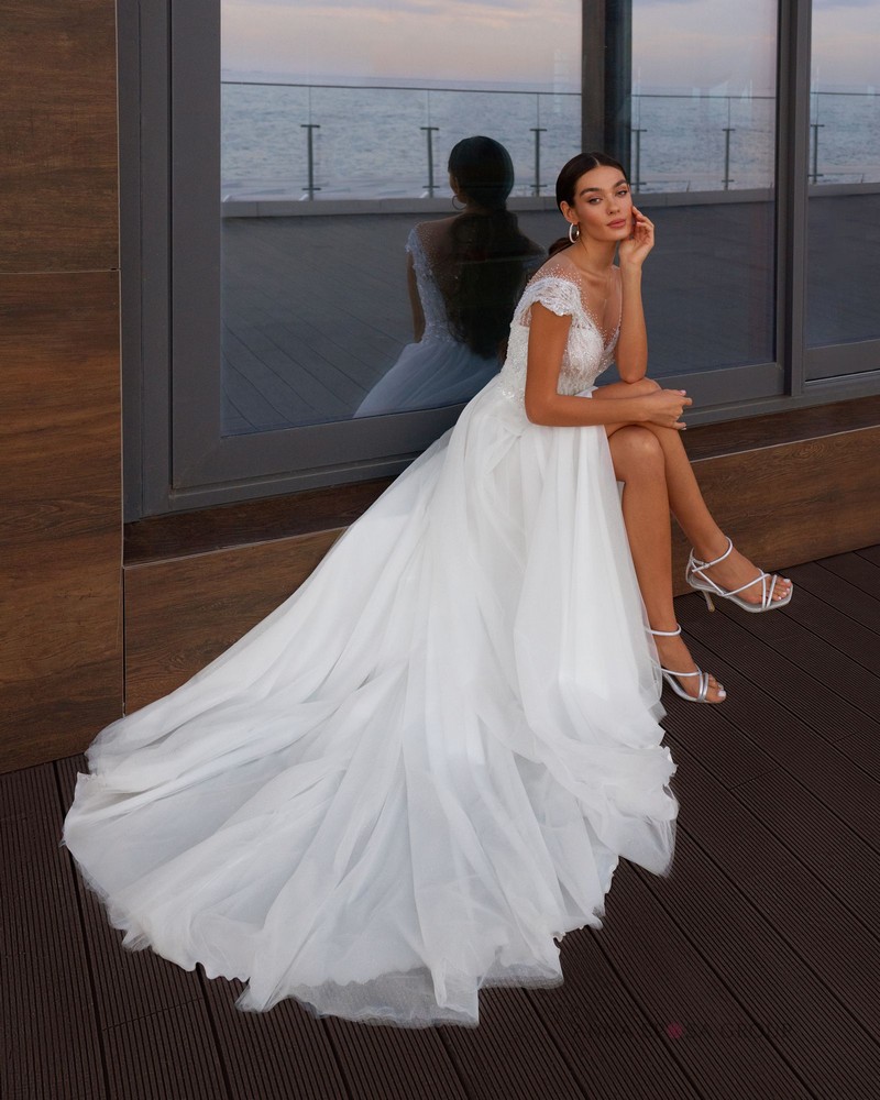 Jednoduše úžasné šaty s jemnou a romantickou siluetou. Živůtek se srdíčkovým výstřihem a nařasením je doplněn o rukávy, které je možné sundat.