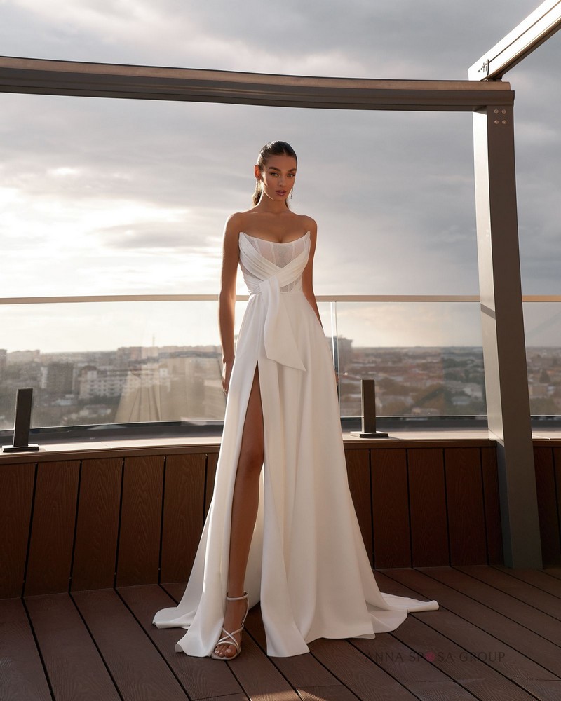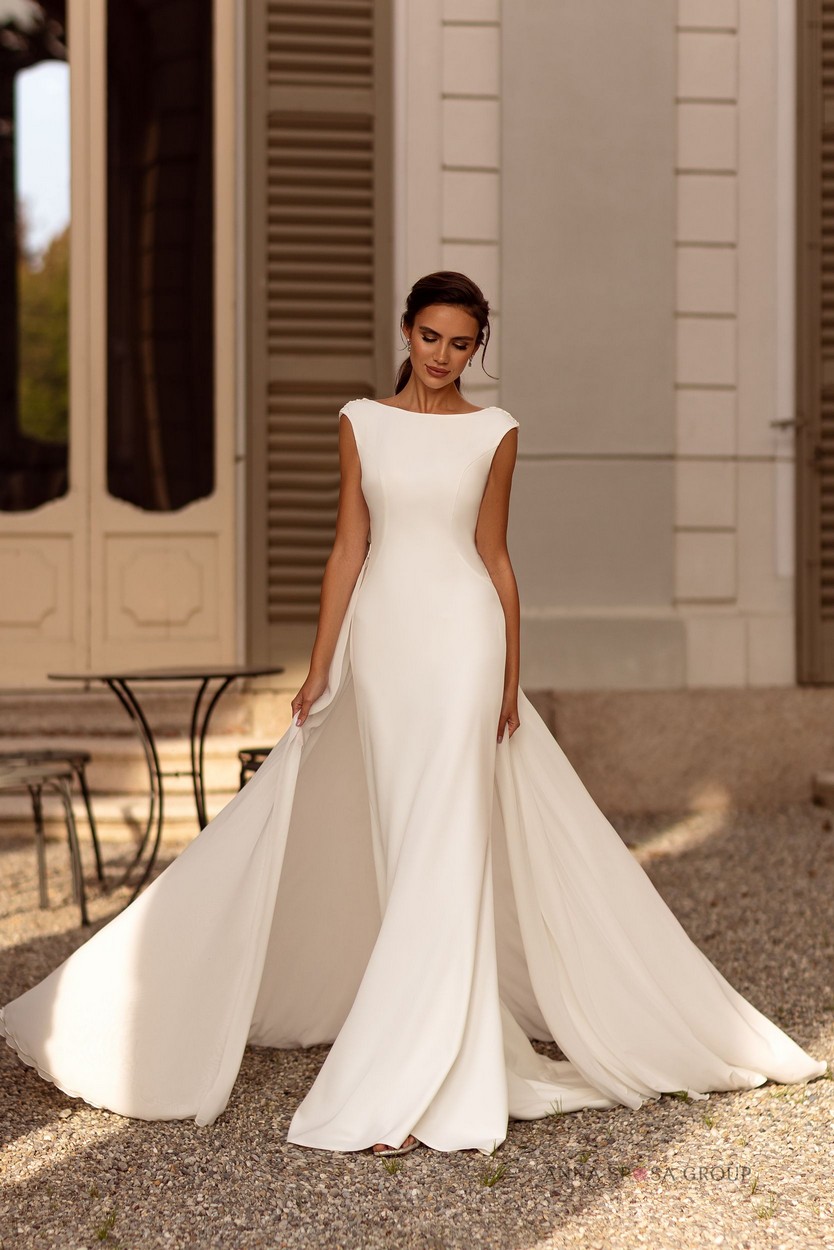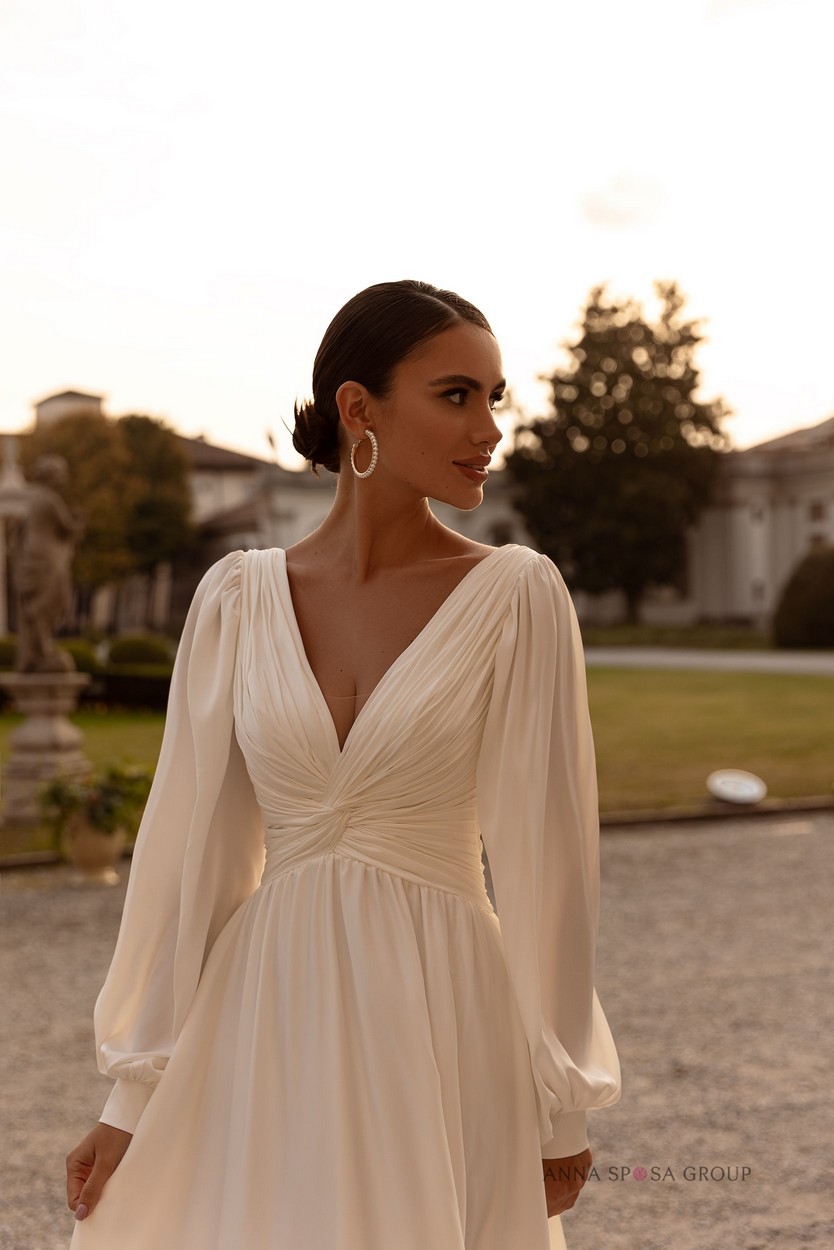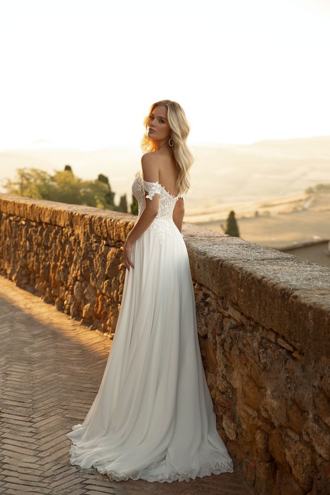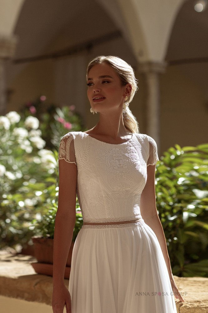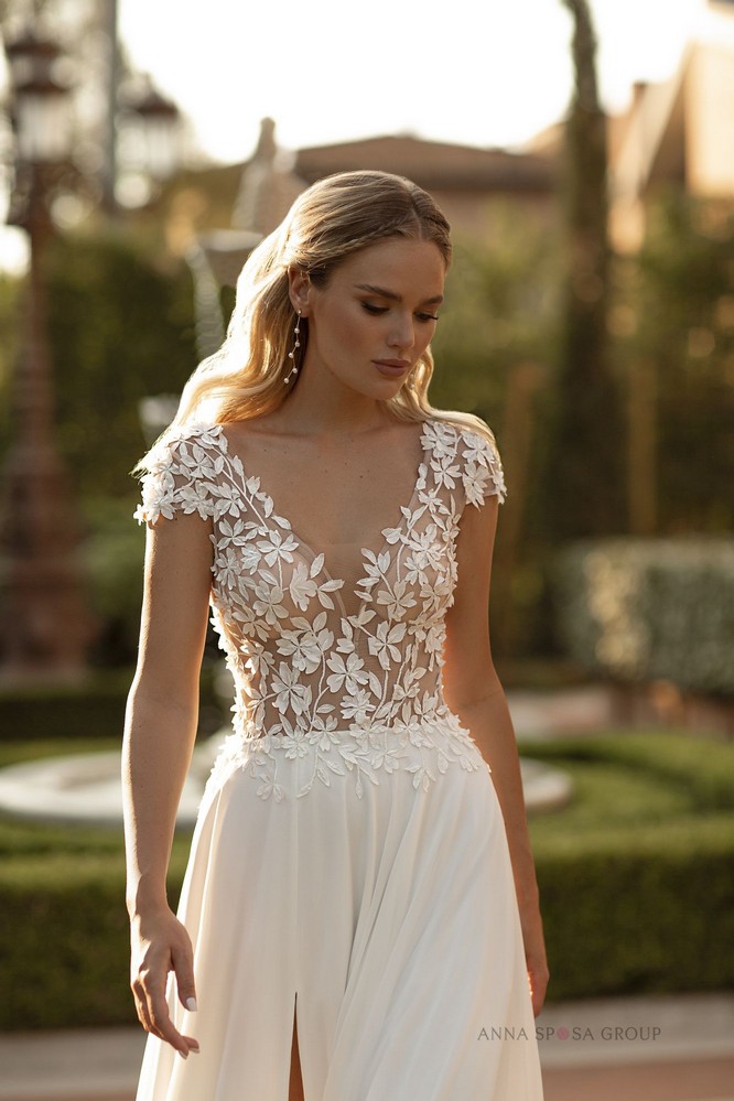 Jemné klasické šaty A-Line s krátkými rukávy. Živůtek je bohatě zdoben originální matnou krajkou s monogramovými vzory. A lehká splývavá sukně doplňuje vzhled a dělá jej extrémně ženský, vzdušný a něžný.